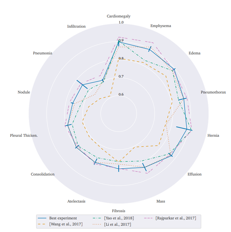 图 5.6:本论文中最佳模型与其他组的比较。病理按照所有组的平均 AUROC 增加进行分类。对于本文提出的模型,将所有折叠的最小和最大 AUROC 报告为误差条,以说明随机数据集拆分的影响。