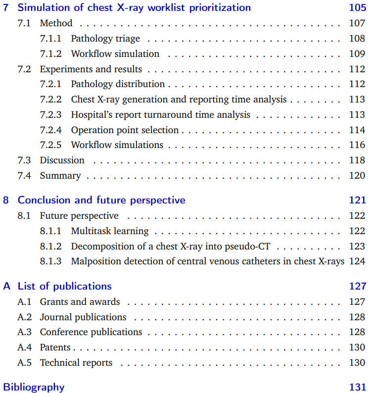 第 7 章介绍了将深度学习的疾病分类转化为特定的临床应用。在获得胸部 X 光片后,通常会将它们分类到工作清单中。根据每个放射科的工作流程,该工作清单按采集时间或手动优先级标签进行排序,并且在很大程度上,放射科医生按顺序处理他们的工作清单项目。因此,工作清单只按照先进先出的原则进行处理。一种最先进的胸部 X 光疾病分类算法可以自动分配优先级标签,这可以大大改善工作列表的排序。本章介绍了一种用于模拟临床工作日的新颖模拟框架,它突出了自动优先工作列表的效果。该框架使用来自汉堡-埃彭多夫大学医学中心的经验数据,可以模拟一个临床工作日,其中包括胸部 X 射线生成过程、胸部 X 射线的自动疾病分类以及放射科医师生成最终报告所需的时间 [ Baltruschat 等人,2020b]。值得注意的是,使用了第 5 章和第 6 章中提出的用于胸部 X 线疾病分类的改进方法。