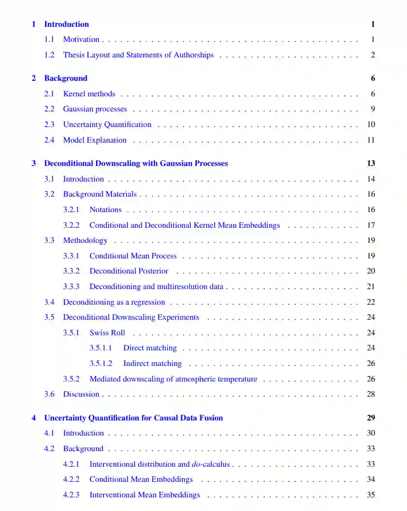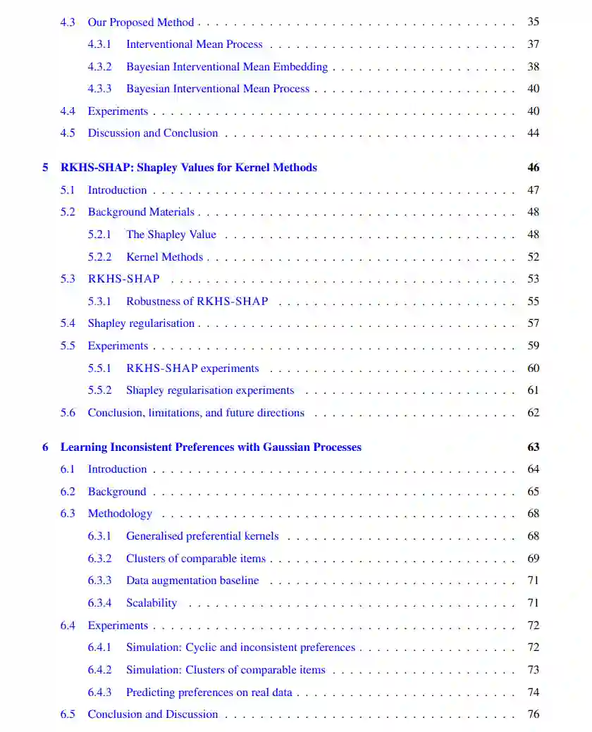 在本文中,我提出了我的贡献,通过倡导更原则性的不确定性量化和更有效的可解释性工具,来提高机器学习的安全性和透明度。在整个论文中,我严重依赖于使用核均值嵌入[Muandet等人,2017]和高斯过程[Rasmussen和Williams,2005b]作为非参数方法来捕获和建模概率分布。这两种方法都依赖于正定核。前者利用它们作为再现核来构建函数空间,并将分布作为其中的元素,而后者利用它们作为协方差函数。第二章正式介绍了这两类方法的细节。此外,在第三章中,我提出了一个项目,展示了这两种方法的相互结合使用,以解决具有挑战性的图像重建问题。
