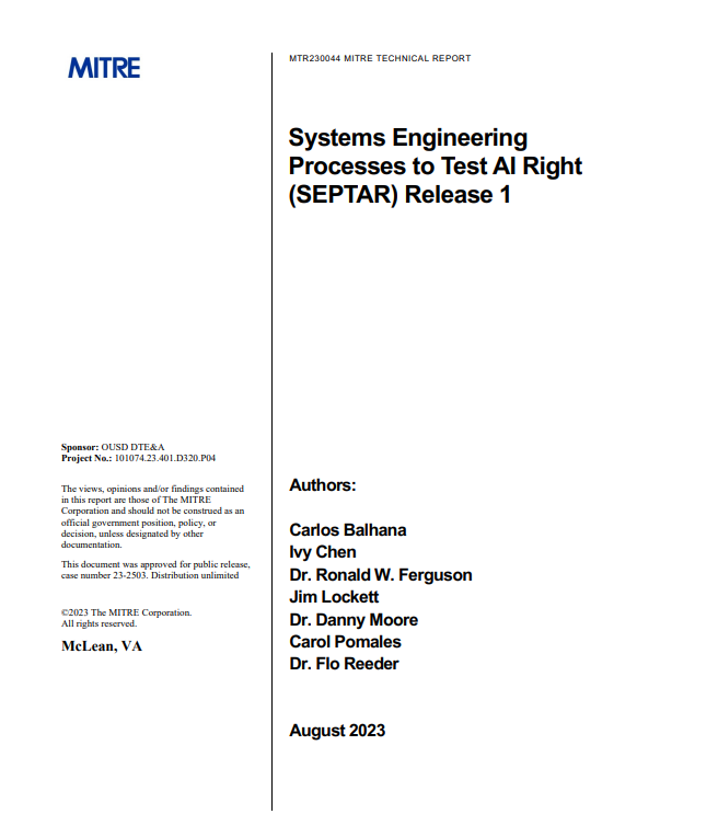 本报告由支持开发测试评估与分析 (DTE&A) 的美国MITRE 团队编写。MITRE 团队与美国国防部各组织(DOT&E、CDAO、DTE&E)的其他 AIES 主题专家 (SME)、学术合作伙伴(包括弗吉尼亚理工学院和州立大学、佐治亚理工学院研究所、卡内基梅隆大学和约翰霍普金斯大学应用物理实验室)以及其他联邦资助研发中心运营商(航空航天公司、国防分析研究所)和科学测试与分析技术卓越中心进行了广泛的审查。