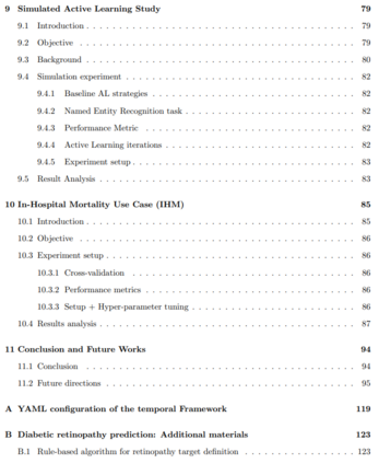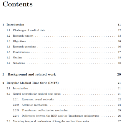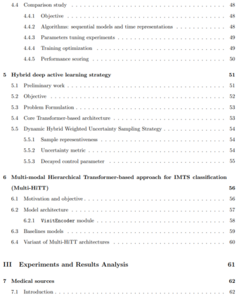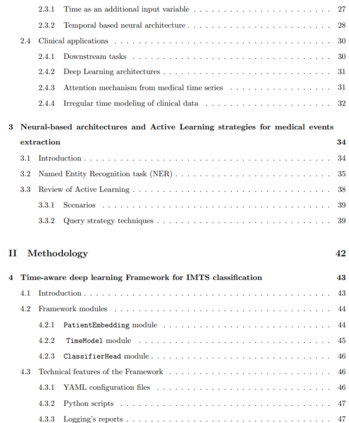 本论文分为三个部分。第一部分提供了促使我们做出贡献的相关工作,并分两章组织。在第一章中,我们建立了一个关于代表不规则临床时间序列的时间感知深度学习模型的调查。第二章详细介绍了用于命名实体识别的基于神经的架构和主动学习策略。另一方面,第二部分揭露了我们的三个主要贡献。第一章描述了已实现的时间框架,允许医学研究团队进行比较研究,并根据他们的数据集和预测任务选择最佳的DL模型来对IMTS进行分类。第二章定义了一种新的主动学习策略--动态混合加权不确定性采样(Dynamic-HWUS),旨在减少用于训练基于Transformer的命名实体识别模型的临床笔记的注释成本。第三章介绍了Multi-HiTT架构,该架构旨在结合不同层次的时间性和输入数据的类型,以建立一个准确的病人的代表。最后,第三部分包括三项验证我们提出的方法并使用真实世界的临床数据库的研究,讨论其结果,总结论文工作,并介绍对未来工作的建议。