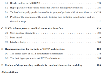 本论文工作的第一部分涉及临床事件时间序列中不规则时间戳的建模。由此产生的主要贡献是实现了一个不规则时间序列的端到端分类的通用框架。该框架处理数字和分类的医疗事件,并支持病人的元数据。此外,它收集了最先进的序列深度学习模型和时间表示技术。利用这个框架,我们对1型糖尿病患者的糖尿病视网膜病变预测进行了实证研究,基于12种基于时间神经的方法的比较研究。数据收集自法国数据库CaR´eDIAB[52],包括1,207个1型糖尿病患者的HbA1c记录的高变量单变量医疗时间序列。