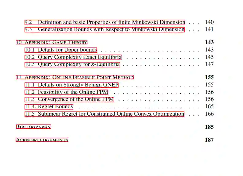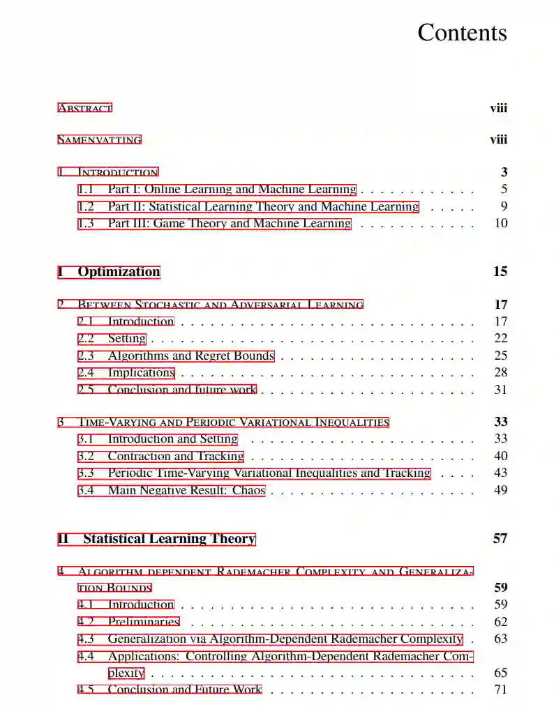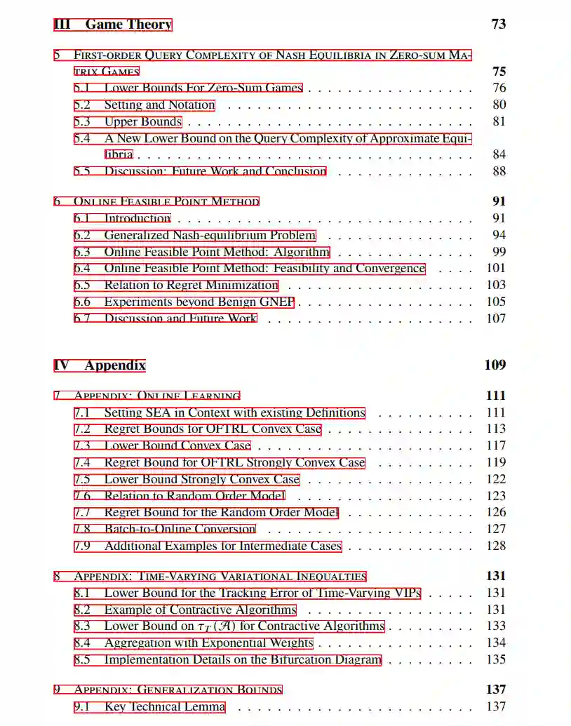本论文探讨了理论机器学习的多个方面,特别是关于优化、博弈论和泛化界的研究。因此,论文分为三个部分: 第一部分 关注机器学习中的优化问题。具体而言,我们为介于随机学习和对抗学习问题之间的在线凸优化问题提供了新的遗憾界。此外,我们对多种一阶算法在时变变分不等式上的行为提供了新的见解。这些结果与强凸优化问题的动态遗憾界以及时变博弈的平衡追踪保证相关,因此也与第三部分(关于机器学习中的博弈论方面)的研究有关。在第三部分中,我们首次提出了零和博弈中计算纳什均衡的查询复杂性的非平凡下界。此外,我们为广义纳什均衡问题引入了一种在线可行点方法。对于广义博弈的一个子类,我们证明了该方法可以保证收敛到广义纳什均衡,同时在所有迭代中保持可行性。