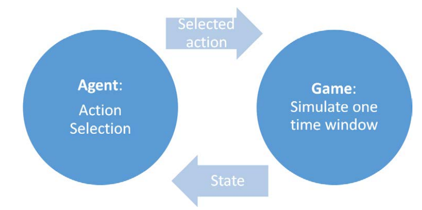 上述应用程序涉及两个主要软件组件。首先,需要有要模拟场景的规则和物理约束的模型(所谓的模拟器),其次,在模型所代表的冲突中控制一个或两个参与者的 AI 算法。本节介绍了这两个组件及其集成。在当前场景中,博弈的一方由 AI 智能体进行,而另一方则由游戏引擎本身通过预先编写好的条件动作进行控制。具体来说,AI 控制攻击的红色战斗机,而游戏引擎控制蓝色防空炮组。