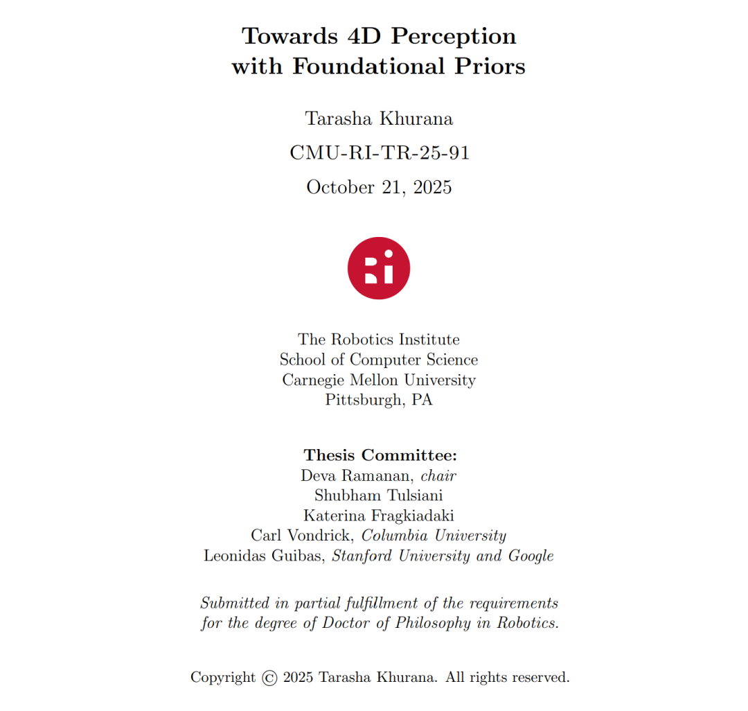 作为人类,我们始终在与一个三维动态世界进行交互与观察。要在视觉算法中构建这种时空(spatiotemporal)或四维(4D)理解并非易事,因为与二维图像和视频相比,四维数据的规模要少上几个数量级。这凸显了一个关键需求——如何以有意义的方式利用二维数据来实现四维任务。 近期在“基础模型(foundation models)”构建方面的进展,使我们能够从互联网规模的数据中以数据驱动的方式学习到生成性/结构性先验(generative/structural priors),从而免费获取这些丰富的现实世界先验。在本论文中,我们探讨了如何调整和利用这些先验,以应对诸如非显式(amodal)跟踪与补全、动态重建以及下一时刻预测等四维感知任务。