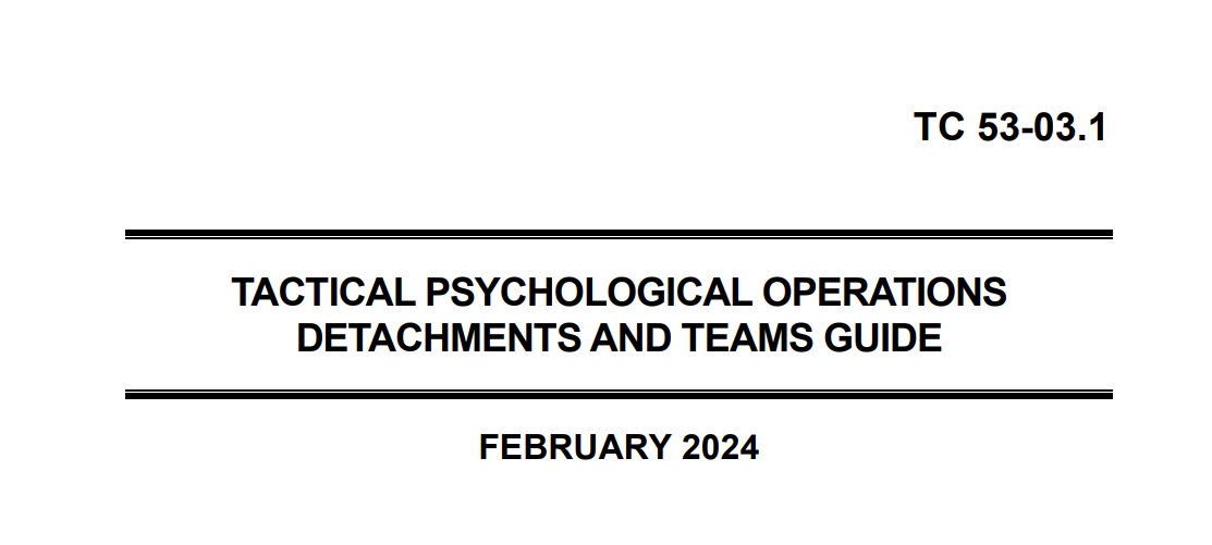 TC 53-03.1 是一份新出版物,提供信息和培训指导,以协助心理作战单元在不利或敌对环境中执行影响活动。该出版物是对即将出版的 ATP 3-53.6《心理战分遣队》的扩充和补充。
