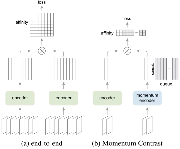 这一对比损失函数充当一个无监督目标函数,用于训练表征查询和键的编码器网络。总体来说,查询表征是 q = f_q(x^q ),其中的 f_q 是一个编码器网络,x^q 是查询样本。