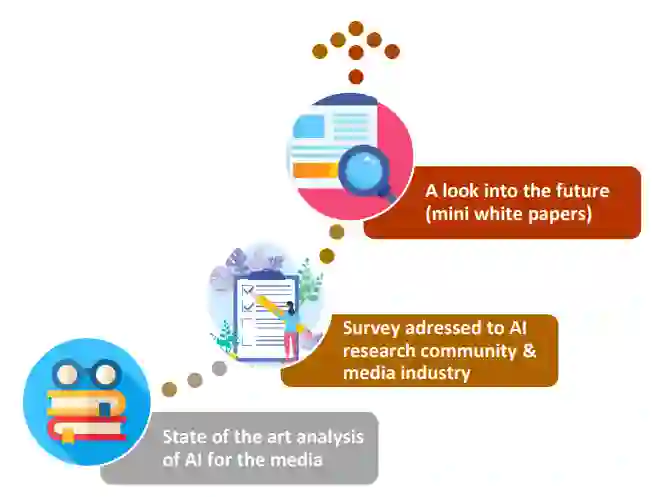 为了分析媒体的人工智能状况,我们采用了多方、多维和多学科的方法,几乎所有的AI4Media合作伙伴、外部媒体或人工智能专家,以及人工智能研究界和广大媒体专业人士都参与其中。为了准确描述这一格局,我们使用了三种主要工具,包括涉及人工智能专家、社会科学、伦理和法律问题专家以及媒体行业从业人员的多学科最新分析;针对人工智能研究/开发人员和媒体专业人士的公开调查;以及一系列关于人工智能在媒体行业的未来的简短白皮书,这些白皮书关注不同的人工智能技术和应用以及不同的媒体部门,探讨人工智能如何积极地颠覆这个行业,提供新的令人兴奋的机会并减少重要风险。