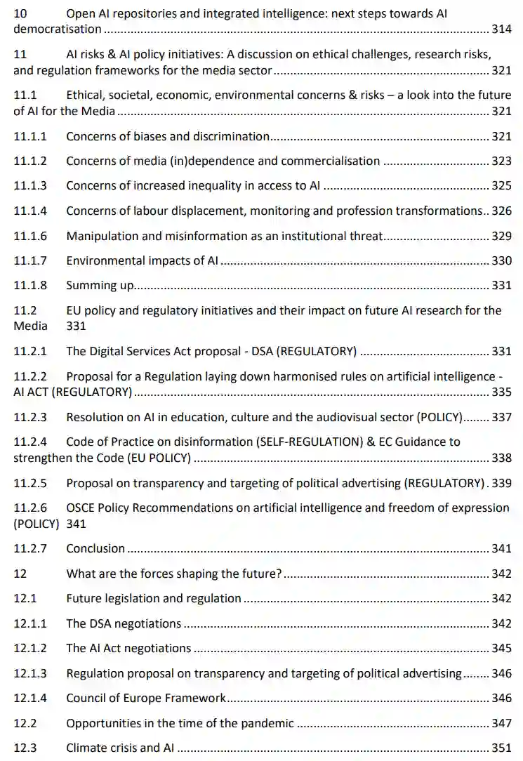 第11节研究了媒体行业采用人工智能所带来的道德、社会、环境和经济风险和担忧,包括偏见和歧视、媒体(不)依赖性、获取的不平等、隐私、透明度、问责制、责任、劳动力迁移、作为制度威胁的错误信息,以及环境影响。此外,它还简要介绍了现有的欧盟政策和法律倡议,以及它们对未来媒体行业的人工智能研究的影响。