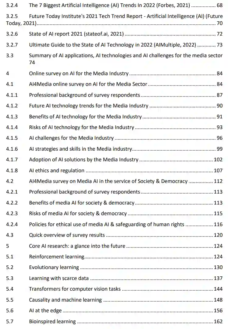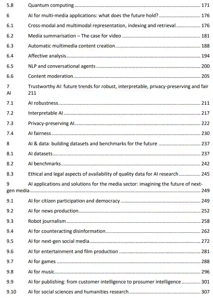 目前的报告对媒体人工智能的现状和未来研究趋势进行了详细分析,涵盖了上述所有方面,形成了一份390页的综合文件。除了完整的报告之外,为了帮助潜在的读者专注于与他们自己的专业知识和兴趣最相关的方面,我们还创建了报告的网络版本,作为AI4Media网站的一部分。这使得读者可以通过一个用户友好的视觉界面轻松浏览本报告的内容,并只阅读/下载涉及他们感兴趣的主题的子章节。