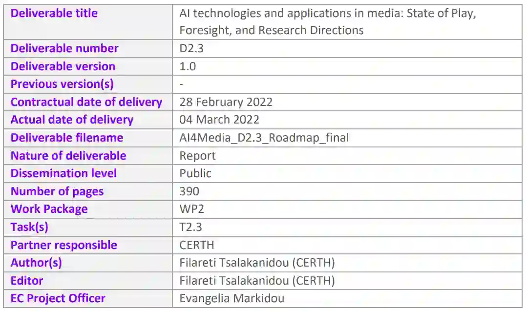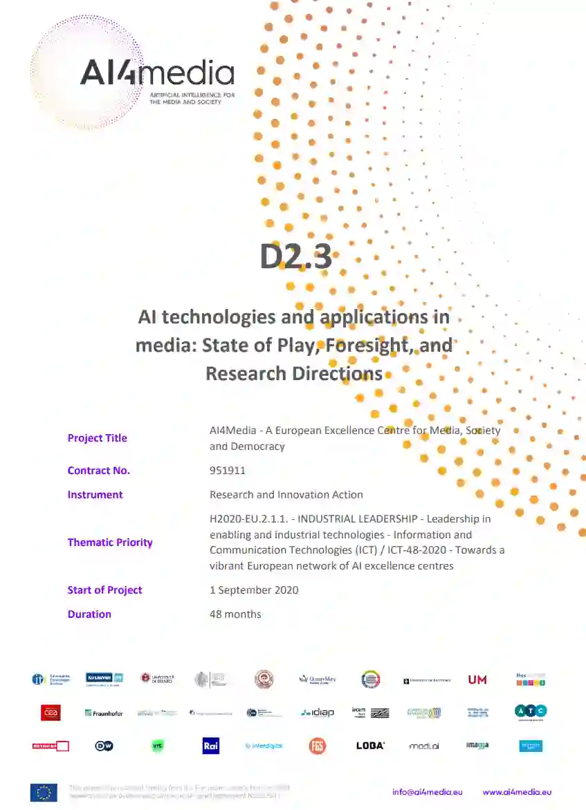 可交付的D2.3 "媒体中的人工智能技术和应用",该文件旨在为媒体行业的人工智能的复杂情况提供一个详细的概述。它分析了媒体行业人工智能(AI)技术和应用的现状,强调了人工智能在改变媒体工作流程、协助媒体专业人员和提高不同行业部门的用户体验方面的现有和未来机会,提供了人工智能技术有望在未来惠及行业的有用实例,并讨论了媒体广泛采用人工智能的促进因素、挑战和风险。