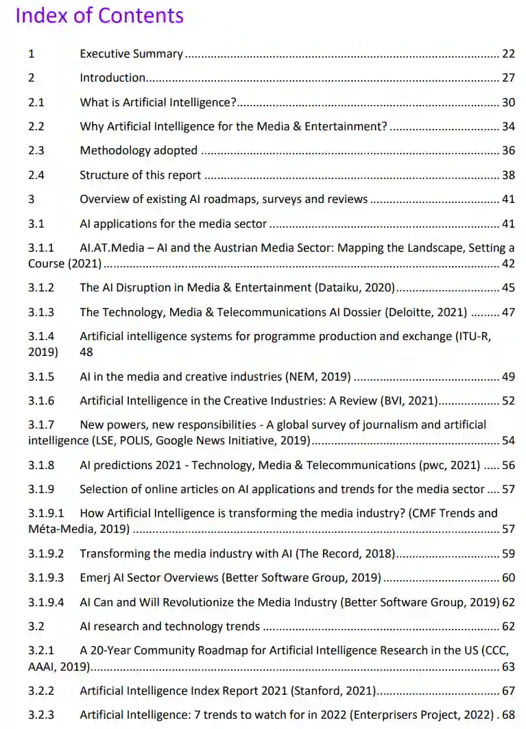 第3部分介绍了从精选的路线图、调查、评论文章和观点文章中得出的主要结论和见解,重点关注人工智能使用的趋势、益处和挑战,旨在提供一幅关于人工智能在媒体和娱乐行业最具变革性的应用的清晰画面,同时也介绍了当前和未来最重要的人工智能研究趋势,这些趋势有可能对整个媒体行业的价值链产生重大影响。