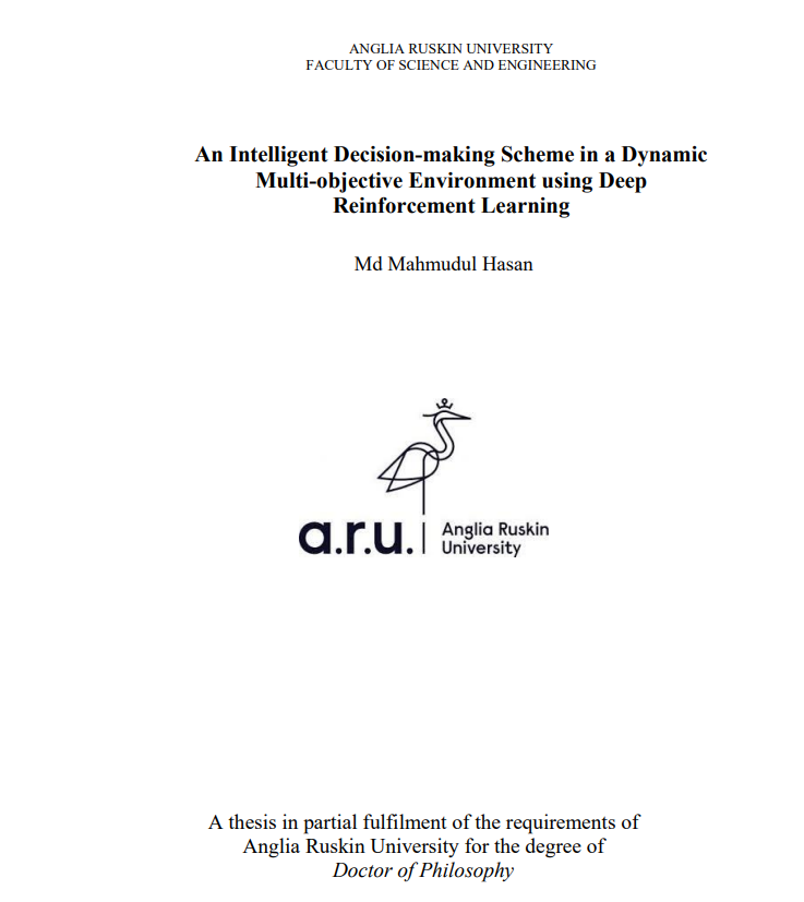 4.Md Mahmudul Hasan, "A robust decision support system in dynamic multiobjective optimization using deep reinforcement learning", 12th Research Student Conference, ARU, UK, 2018.