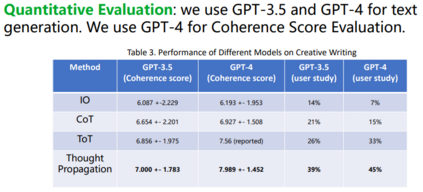 我们可以用各种LLM去解决这个问题,然后用GPT-4评估连贯度。可以看到,GPT4的连贯度比GPT3.5要更好,思维传播也比之前的方式效果更好。请一些人类参与打分也发现,思维传播比之前的方式效果更好。 图12 创意写作的量化实验