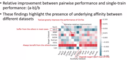 图上的预训练任务通常可以是生成式任务也可以是对比式任务,但对于分子结构来说仍然是一个非常有挑战性的话题。首先,有标注的数据集很少,往往需要昂贵的领域知识来建立。然后往往它们用的分子也都是不一样的。一个比较自然的想法是说,因为这些下游任务都非常小,所以我们能不能结合多个下游任务,比如把几个毒性相关的下游任务和数据放在一起来做微调。通过从基础模型微调的形式去改进可能会是一个更加有效的策略。但这样做有一个问题就是很容易出现负迁移。我们观察一个数据集是否能帮助另一个数据集,红色表示提升很明显。我们可以看到有些规律,例如几乎所有数据集都可以帮助FreeSolv数据集。