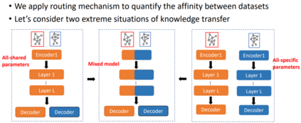 那么能否找到对某个数据集有帮助的数据集呢?我们觉得两个数据集之间的关系分为两种,一种是结构的相关性,另一种是任务的相关性。描述这两种相关性的方式很多,这里不展开讨论。基于这些相关性,我们就可以把单个任务转化成一组任务。在训练的时候,我们就可以把这些数据放到一起算损失。假设这两个数据集关系非常紧密,辅助数据集是非常有用的,那就可以用同一套编码器,只用不同的解码器做不同的任务。另一个极端是,如果两个数据集或者下游任务完全无关,就应该使用两套编码器来训练,才能得到最好的效果。很多情况可能介于两种极端情况之间,他们的任务可能在分布上相似又有一定的区别,这就应该采用中间的混合形式,部分参数共享。