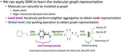 在做微调的时候也有一些有意思的技巧,这里关注分子结构的基础模型,怎样通过不同的任务和任务之间的相似度来增加模型微调的表现。这里介绍一篇最近发表在NeurIPS上面的论文。在分子结构上,我们可以有各种下游任务,例如可溶性、毒性或活性预测等,这是一个非常适合基础模型的场景。基本架构就是用GNN去编码一个分子输入,得到每个节点(原子)的嵌入,然后通过聚合或者池化操作得到分子的嵌入,然后预测各种分子级别的下游任务。Huang T, Hu Z, Ying R. Learning to Group Auxiliary Datasets for Molecule[J]. arXiv preprint arXiv:2307.04052, 2023.