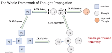 关系推理能否在大语言模型的推理阶段有所帮助呢?目前比较流行的方式是通过设计各种各样的提示(prompt)来使大语言模型更好地解决一些复杂问题,例如思维链(chain-of-thought)、思维树(tree-of-thought)和思维图(graph-of-thought)等,但这些方法还不够高效。鉴于目前的prompt是独立的,所以能否通过探索问题之间、解之间的关系来帮助模型有更强的推理能力,这种方式我们叫做思维传播(thought propagation)。