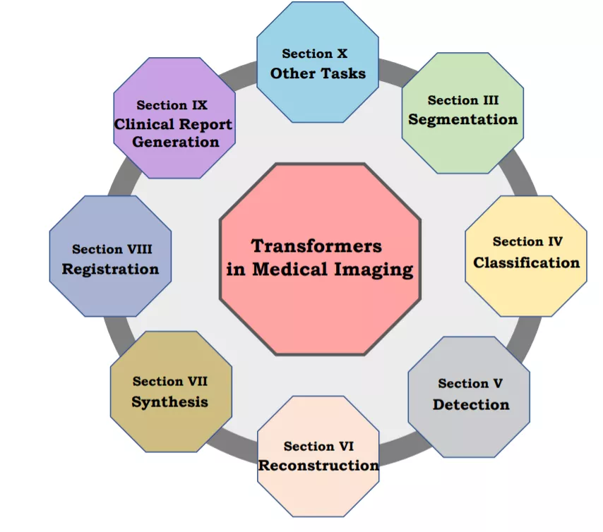 本综述涵盖了Transformer在医学成像中的多种应用领域