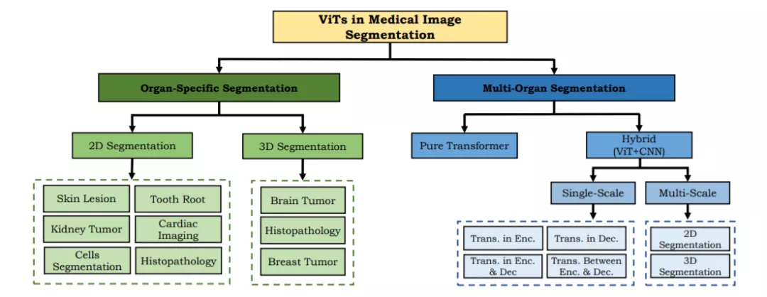 精确的医学图像分割是计算机辅助诊断、图像引导手术和治疗规划的关键步骤。Transformer的全局上下文建模能力对于精确的医学图像分割至关重要,因为通过建模空间距离远的像素之间的关系(例如,肺分割),可以有效地对分布在大接收域上的器官进行编码。此外,医学扫描的背景通常是分散的(如超声扫描[94]);因此,学习与背景相对应的像素之间的全局上下文可以帮助模型防止误分类。下面,我们将重点介绍在医学图像分割中整合基于ViT模型的各种尝试。鉴于两组方法所需的上下文建模水平不同,大致将基于vit的分割方法分为器官特异性和多器官类别,如图5所示。