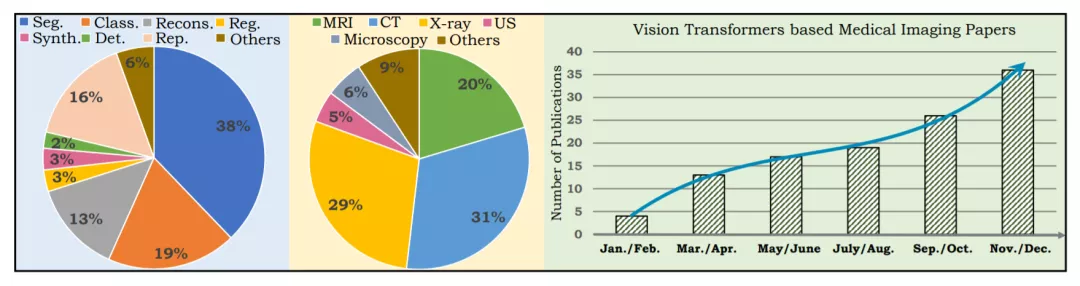 (左)饼状图显示了根据医学成像问题设置和数据模态所包括的调研论文的统计数据。最右边的数字显示了近期文献(2021年)的持续增长。Seg:分割,Class:分类,Recons:重建,Reg:配准,Synth:合成,Det:检测,Rep:报告生成,US:超声