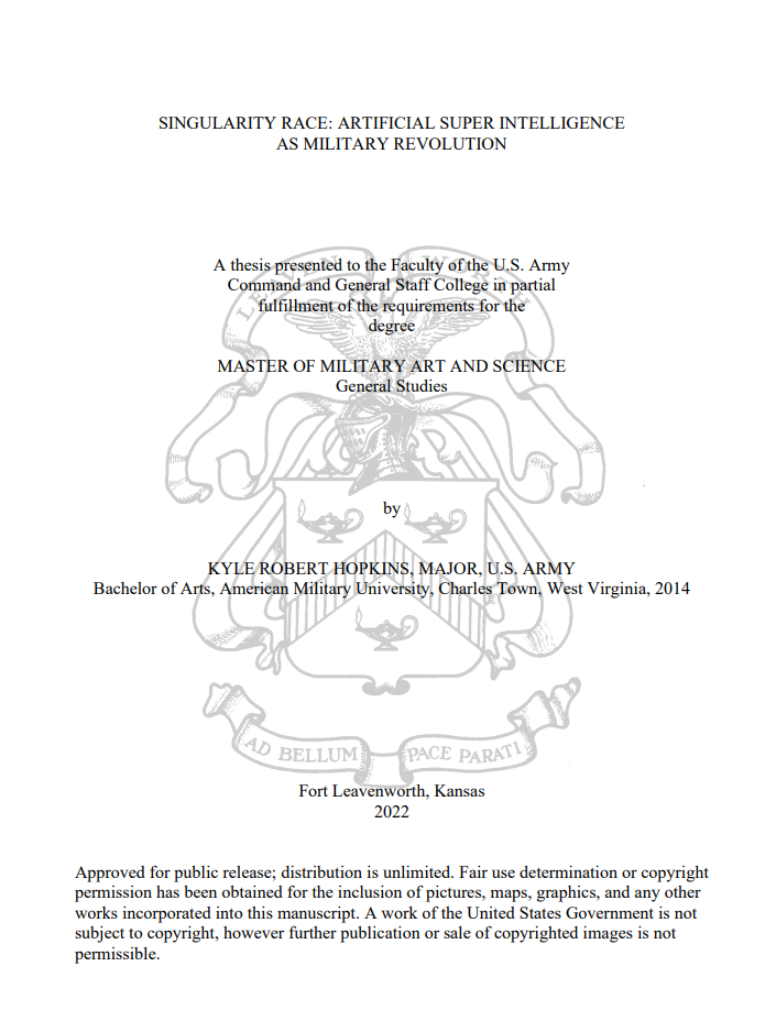 美国防部在超级智能方面的文献有一个明显的空白。这次探索的目的是填补文献空白,确定这种技术所带来的风险程度,并确定对手可能利用ASI攻击美国的潜在漏洞。这将为国防界的决策者提供关于该主题的相关观点,并告知在规划和预测中应考虑该技术的程度。通过额外的研究,如果对手率先获得ASI,可以减轻已确定的漏洞以防止其被利用。最终,本研究的目的是防止ASI军事革命的出现成为一个黑天鹅事件,使美国失去其世界主导地位。