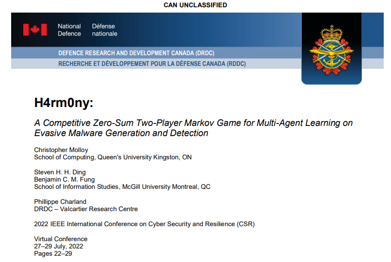 为了打击日益多变和易变的现代恶意软件,机器学习(ML)现在是对现有基于签名的恶意软件分流和识别技术的一种流行和有效的补充。然而,ML也是对手的一个现成的工具。最近的研究表明,恶意软件可以通过深度强化学习(RL)技术进行修改,以绕过基于人工智能和基于签名的反病毒系统,而不改变其原有的恶意功能。这些研究只专注于生成规避样本,并假设静态检测系统为敌人。