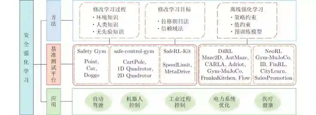 García和Fernández[10]于2015年给出了安全强化学习 (Safe reinforcement learning, SRL) 的定义: 考虑安全或风险等概念的强化学习. 具体而言, 所谓安全强化学习是指在学习或部署过程中, 在保证合理性能的同时满足一定安全约束的最大化长期回报的强化学习过程. 自2015年起, 基于此研究, 学者们提出了大量安全强化学习算法. 为此, 本文对近年来的安全强化学习进行全面综述, 围绕智能体的安全性问题, 从修改学习过程、修改学习目标以及离线强化学习三方面进行总结, 并给出了用于安全强化学习的5大基准测试平台: Safety Gym、safe-control-gym、SafeRL-Kit、D4RL、NeoRL, 以及安全强化学习在自动驾驶、机器人控制、工业过程控制、电力系统优化以及医疗健康领域的应用. 安全强化学习中所涉及的方法、基准测试平台以及应用领域之间的关系如图1所示.