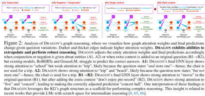 定量分析。在表2中,作者研究了DRAGON在涉及复杂推理的问题上的下游任务表现。作者考虑了几个代理来对复杂问题进行分类:(i)是否存在否定(例如no, never), (ii)是否存在连词(例如and, but), (iii)是否存在套语(例如sometimes, maybe), (iv)介词短语的数量,以及(v)实体提到的数量。有否定或连接表示逻辑上的多步骤推理,有更多的介词短语或实体提及表示涉及更多的推理步骤或约束,有套语表示涉及复杂的文本细微差别。DRAGON在所有这些类别上的表现都明显优于基线LM (RoBERTa)(例如,否定的准确率为+14%),这证实了作者的联合语言知识预训练提高了推理能力。DRAGON也始终优于现有的KG-augmented QA模型(QAGNN, GreaseLM)。作者发现QAGNN和GreaseLM只在某些类别如连词或许多介词短语(= 2,3)上在RoBERTa上有适度的提高,但DRAGON提供了实质性的提高。这表明,通过使用更大、更多样化的数据进行自监督的预训练,DRAGON比只进行微调的模型(如GreaseLM)学习了更多通用推理能力。