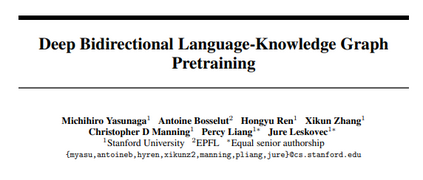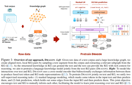 作者提出了DRAGON,一种自监督的预训练方法,从文本和知识图(KGs)中学习深度双向的语言知识模型。在通用和生物医学领域,DRAGON在各种NLP任务上都优于现有的语言模型和KG-augmented模型,并在回答涉及长上下文或多步骤推理的问题等复杂推理方面表现强劲。