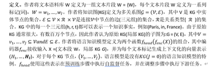 给定一个文本语料库W和一个较大的知识图G,作者通过准备(文本段W,局部知识图谱 G)对来为模型创建输入实例。作者希望每对文本的文本和KG(大致)语义对齐,以便文本和KG可以相互告知,并促进模型学习两种模式之间的交互推理。