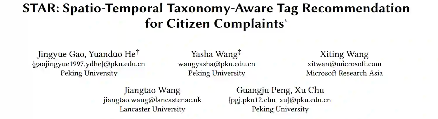 题目: STAR: Spatio-Temporal Taxonomy-Aware Tag Recommendation for Citizen Complaints