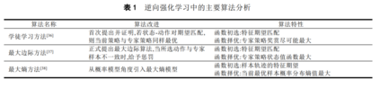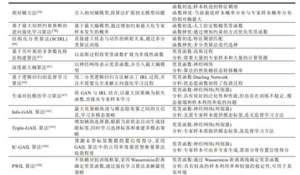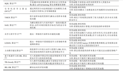 表 1 将对前 9 章提到的主要算法以表格形式分析比较,介绍算法相比之前算法的创新点,并分析算法的优缺点和关键特性,例如:奖赏函数的类型、奖赏函数的选择方式、基于模型算法(model-based)或无模型算法(model-free)、算法复杂度和样本利用率等.
