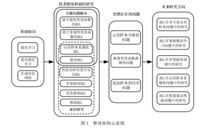 Ho等人将在计算机视觉领域取得优秀成果的生成对抗网络[46](Generative Adversarial Networks, 简称GAN)与逆向强化学习结合,提出生成对抗模仿学习算法[47](Generative Adversarial Imitation Learning, 简称GAIL).该算法将逆向强化学习过程抽象为求解奖赏函数的IRL过程和求解最优策略的RL过程,并指出两个过程的交替迭代为零和博弈问题,因此可用生成对抗思想解决.相比非线性逆向强化学习算法,GAIL具有更小的计算量和更高的性能,但也存在训练不稳定、模态崩塌[48](mode collapse)和生成样本利用率低的问题[49,50]. 近年来,逆向强化学习方法在机器最优控制领域、状态动作信息不完全领域、多智能体领域和提高专家样本利用率等领域都取得了进展,也有学者将专家样本最优性假设进行扩展,解决专家样本非最优问题[51-53],此外还有指导逆向强化学习方法研究等[54-60]. 逆向强化学习方法发展至今,已成为模仿学习方法中最重要的实现方式.本文将基于以上分类,梳理逆向强化学习的发展脉络,分析其发展的内部机理,探讨其优势和不足,并总结未来可能的发展方向.本文的结构框架如图 1 所示,下文将按照图 1 结构,介绍逆向强化学习领域的关键论文和最新进展.