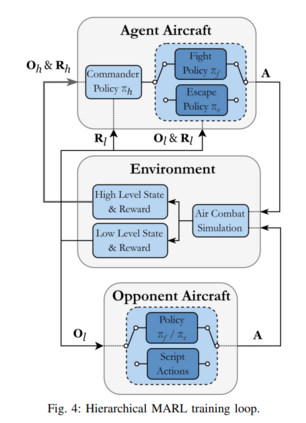 应用人工智能模拟空对空作战场景正引起越来越多的关注。迄今为止,高维状态和行动空间、高度复杂的情况信息(如不完全信息和过滤信息、随机性、对任务目标的不完全了解)以及非线性飞行动态对准确的空战决策构成了巨大挑战。当涉及多个异构代理时,这些挑战会更加严峻。我们为具有多个异构代理的空对空作战提出了一个分层多代理强化学习框架。在我们的框架中,决策过程分为两个抽象阶段,异构的低级策略控制单个单位的行动,而高级指挥官策略则根据总体任务目标下达宏观命令。低层次政策是为精确控制部队作战而训练的。它们的训练是按照学习课程安排的,其中包括日益复杂的训练场景和基于联赛的自我比赛。根据预先训练好的低级策略,对指挥官策略进行任务目标训练。经验验证证明了我们设计方案的优势。