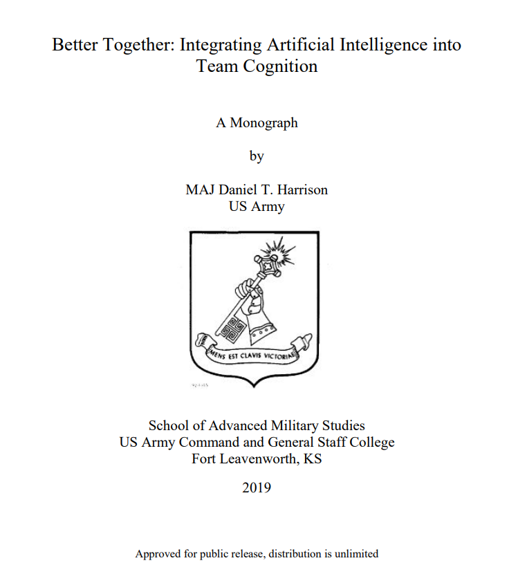 合成有机团队认知的两大障碍是美陆军领导的文化阻力和军事决策的结构框架。首先,也是最重要的一点是,领导者必须持续观察人工智能工具并与之互动,建立信心并接受其提高认知能力和改善决策的能力。在引入人工智能工具的同时,几乎肯定会出现关于机器易犯错误或充满敌意的说法,但必须通过展示人工智能的能力以及与人类团队的比较,来消除和缓和对其潜在效力的怀疑。将人工智能工具视为灵丹妙药的健康而合理的怀疑态度有可能会无益地压倒创新和有效利用这些工具的意愿。克服这一问题需要高层领导的高度重视和下属的最终认可。其次,这些工具的结构布局很可能会对它们如何快速体现自身价值产生重大影响。开始整合人工智能工具的一个看似自然的场所是在 CTC 环境中,以及在大型总部作战演习的大型模拟中。最初的工具在营级以下可能用处不大,但如果纳入迭代设计、军事决策过程或联合规划过程,则几乎肯定会增强营级及以上的军事规划。虽然在本作品中,对工具的描述主要集中在与指挥官的直接关系上,但在最初的介绍中,与参谋部的某些成员(包括执行军官或参谋长、作战军官和情报军官)建立直接关系可能会更有用。与所有军事组织一样,组织内个人的个性和能力必须推动系统和工具的调整,使其与需求保持平衡。