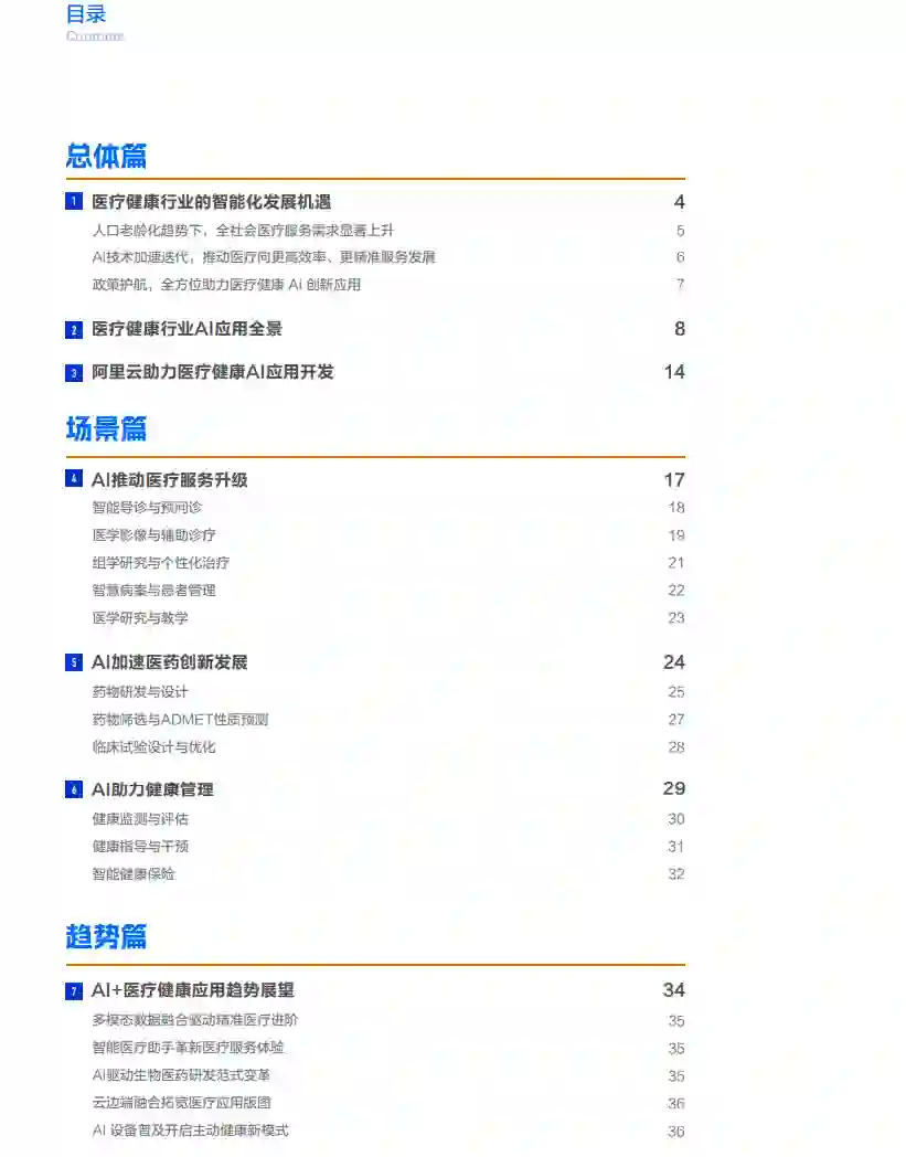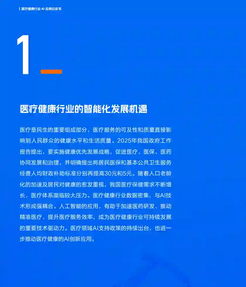 医疗健康行业是维护全民福祉的重要基石,始终是全球关注的焦点。当前普遍的亚健康状态,以及老龄化带来的慢性疾病增加等,不仅影响着人们的生活质量,也给医疗体系带来了沉重负担。我国医疗体系的“不可能三角”依然突出,即便宜、高效和服务难以兼顾。优质的医疗服务供不应求,医护人员负担较重,而基层医疗能力相对较弱,患者的就医体验也需要进一步提升。另一方面,疾病谱变化快,药物研发周期长、资金需求庞大且成功率较低,现有供给难以快速应对,很大程度上也限制了医疗的突破发展。 面对这些挑战,人工智能技术,特别是以大型模型为代表的生成式AI的迅猛发展,为医疗健康注入了新的机遇。AI的应用能够快速分析海量且复杂的医疗信息,从而支持更加精准的医疗决策,协助医生做出更为科学合理的诊断与治疗规划,有效减轻医护人员的工作压力,并缓解医疗资源紧张的局面。此外,AI技术正在推动医疗服务向自动化和智能化转变,优化包括预约挂号、诊疗服务、费用结算、检验检查等在内的各个环节,将极大提升患者的就医体验。同时,AI助力生物分子结构预测与生成、加快靶点识别和发现,提升药物分子设计与优化,提升临床试验的效率,有效地缩短新药研发周期、降低研发成本、加速新药上市,为医药创新带来新的动力。 AI已经深入医疗健康的各个层面,成为连接医疗机构、科研机构、制药企业以及广大患者的重要纽带,助力构建更加高效、智能、个性化的医疗生态系统。本白皮书将深入探讨AI在医疗健康行业的应用现状、发展趋势和未来机遇,为行业参与者提供有价值的参考和建议。