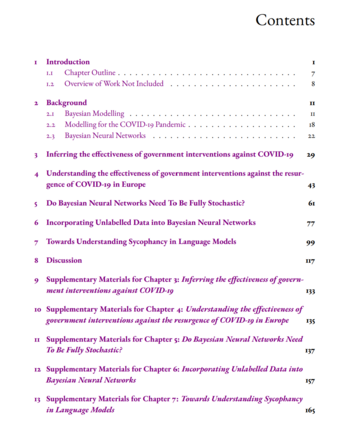 机器学习模型已广泛应用于许多高风险领域,包括医疗保健和刑事司法。由于这些模型被用来做出重要决策,例如是否为客户提供贷款,因此在采取行动之前量化不确定性至关重要。如果不这样做,我们就可能采取不适当的行动,将错误的信任寄托在潜在有缺陷的模型估计上。因此,在本论文中,我们开发了针对不同领域的不确定性估计方法。首先,我们专注于理解政府干预对COVID-19传播的影响。我们使用贝叶斯建模,这为在不确定性下的推理和决策提供了一个有原则的框架。具体而言,我们使用半机械化层次模型来提供干预效果大小的稳健估计。在这种情况下,模型参数和潜在变量具有语义意义,数据集较小,且准确推理是可行的,贝叶斯方法表现出色。接下来,我们将注意力转向使用神经网络的监督学习。与COVID-19模型不同,即使拥有大量计算资源,在这种设置下近似推理也是不准确的。此外,在这些黑箱模型中设置先验是具有挑战性的。为了取得进展,我们认为预测算法不必保持每个模型参数的分布,而是部分随机网络同样有充分的理论支持。接着,我们开发了部分随机贝叶斯神经网络,利用未标记数据改进先验预测分布。随后,我们展示了贝叶斯建模如何与现代无监督学习方法有效结合,通过使用大型语言模型从结构化输入中提取特征。这些特征可以输入到贝叶斯模型中,以理解复杂现象并提供不确定性估计。总的来说,我们展示了多种不同的方法是获得有用且适当不确定的预测所必需的,并提供了对贝叶斯方法在现代机器学习中应用的深入见解。