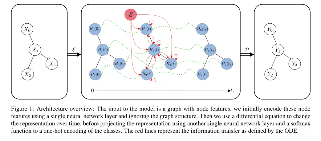 摘要:本文建立在图神经网络与传统动力系统之间的联系之上。我们提出了连续图神经网络(Continuous Graph Neural Networks, CGNN),由于CGNN可以看作是一种特定的离散化方案,它进一步推广了现有的具有离散动力学的图神经网络。其核心思想是如何刻画节点表示的连续动力学,即节点表示的导数。受现有的基于图扩散的方法(如社会网络上的PageRank模型和流行病模型)的启发,我们将导数定义为当前节点表示、邻居表示和节点初始值的组合。我们提出并分析了图上的两种可能的动力学--包括节点表示的每一维(也称为特征通道)独立改变或者彼此交互-这两者都有理论上的合理性。所提出的连续图神经网络对过于过平滑具有较强的鲁棒性,因此可以建立更深层次的网络,从而能够捕获节点之间的长期依赖关系。在节点分类任务上的实验结果证明了我们提出的方法在与基线模型竞争上的有效性。
