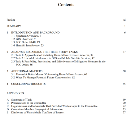 《2021财年国防授权法》第1663条要求美国防部(DoD)与美国国家科学、工程和医学研究院签订协议,对联邦通信委员会2020年4月19日通过的命令和授权(FCC 20-48)进行独立的技术审查,只要该命令和授权影响国防部的设备、操作或活动。美国防部长办公室、首席信息官在空军研究实验室的协助下,与国家研究院签订了一份合同,国家研究院任命了审查联邦通信委员会第20-48号命令授权在GPS频段附近运行地面无线电网络的委员会(委员会成员简历见附录D),按照附录A的任务说明进行研究。