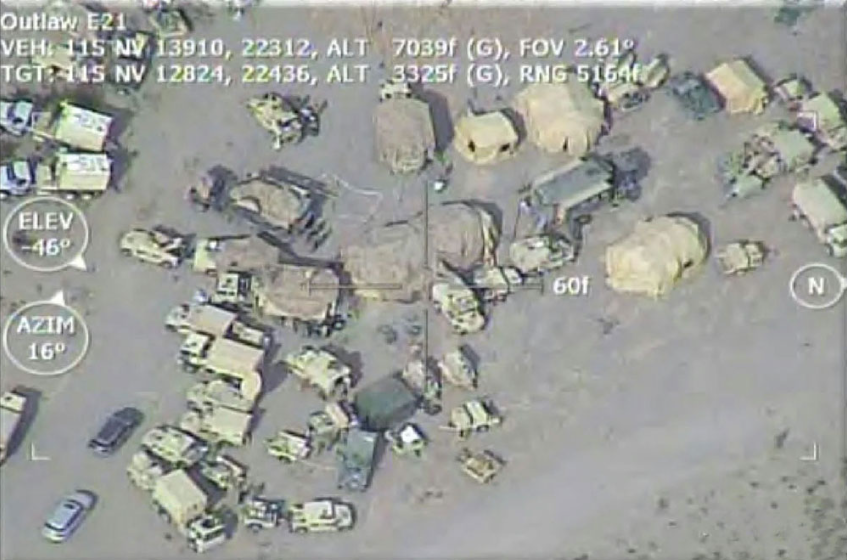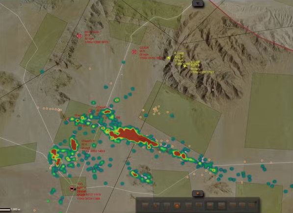 图:这张卫星图像显示了在加利福尼亚州欧文堡训练的一个旅级战斗队(brigade combat team)的电子发射信号。亮红色区域是指挥所的发射信号。