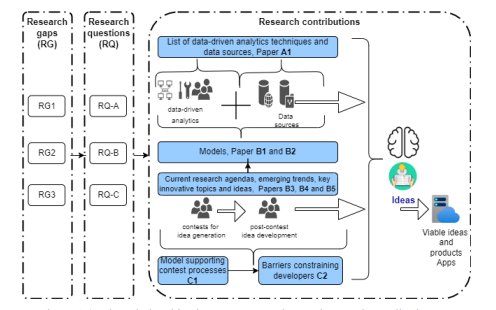 本节介绍了本论文中涉及的研究差距(RG)。研究差距分为三大类,以简化本论文的阐述和逻辑连贯性:1)缺乏有组织的数据源和数据驱动的分析技术来支持创意的产生;2)缺乏支持机器学习驱动的创意产生的过程模型;3)缺乏支持竞赛的过程模型和框架来应对创意产生的竞赛后障碍。