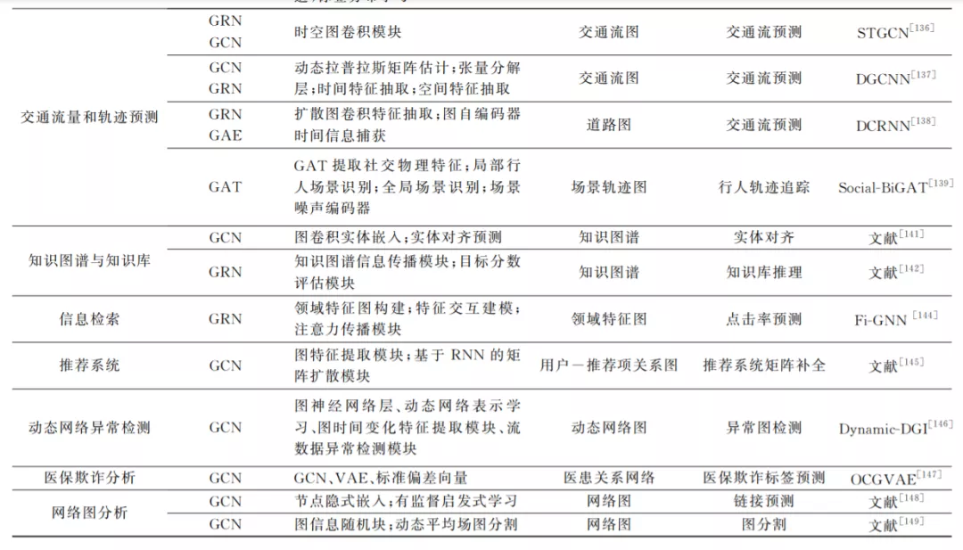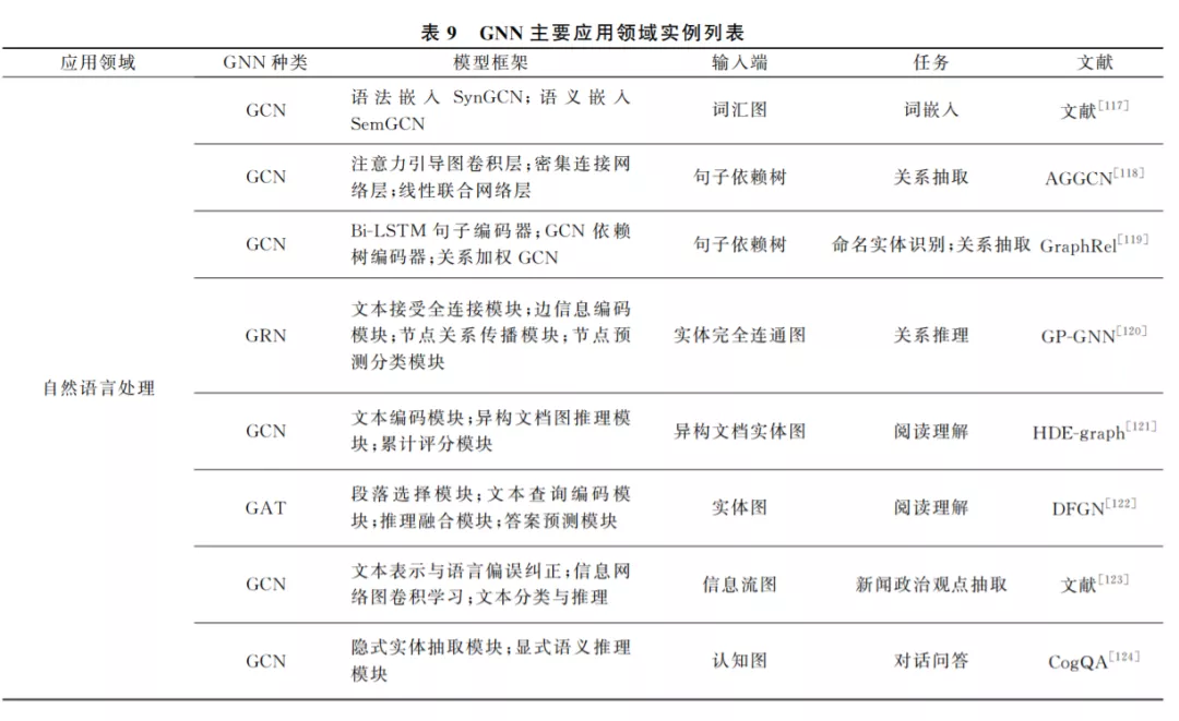 由于 GNN 能较好地学习图结构数据的特征, 因此在许多图相关的领域有着广泛的应用.若按照 应用中图的层次结构划分,则大体可以分为节点、边 和图层面.在节点层面,常见的有节点分类、节点聚 合、节点表示学习.在边层面,则有边分类、边聚类以 及链接预测.在图层面,图分类、图生成、子图划分、 图相似度分析等应用较为广泛.按照图的种类划分, 可以分为引文网络、社交网络、交通网络、图像、化合 物分子结构、蛋白质网络等.按照应用领域划分,可 以分为自然语言处理、图像处理、轨迹预测、物理化 学和 药 物 医 学 等.为 了 方 便 说 明 和 阐 述, 本 文 从 GNN 的主要应用领域这一角度出发,对近年来出现 的 GNN 应用实例进行分类归纳。