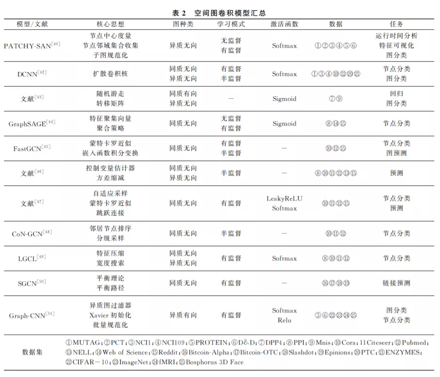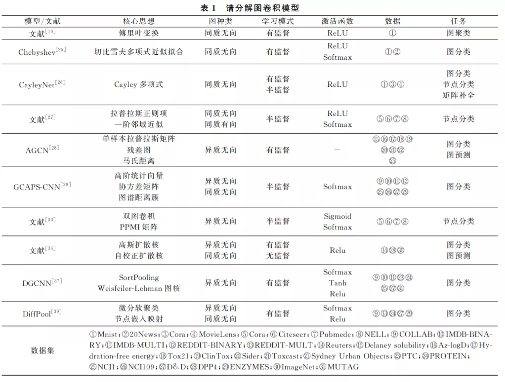 图 卷 积 网 络 (GraphConvolutionalNetwork, GCN)进行卷积操作主要有两种方法:一种是基于 谱分解,即谱分解图卷积.另一种是基于节点空间变 换,即空间图卷积.Bruna等人[10]第一次将卷积神 经网路泛化到图数据上,提出两种并列的图卷积模 型———谱分解图卷积和空间图卷积.Bruna等人对 比分析了一般图结构数据和网格数据共有的特点和 不同之处,综合运用了空间图卷积和谱分解处理图 像聚类问题.下面本文对谱分解图卷积和空间图卷积进行详细的梳理和介绍。