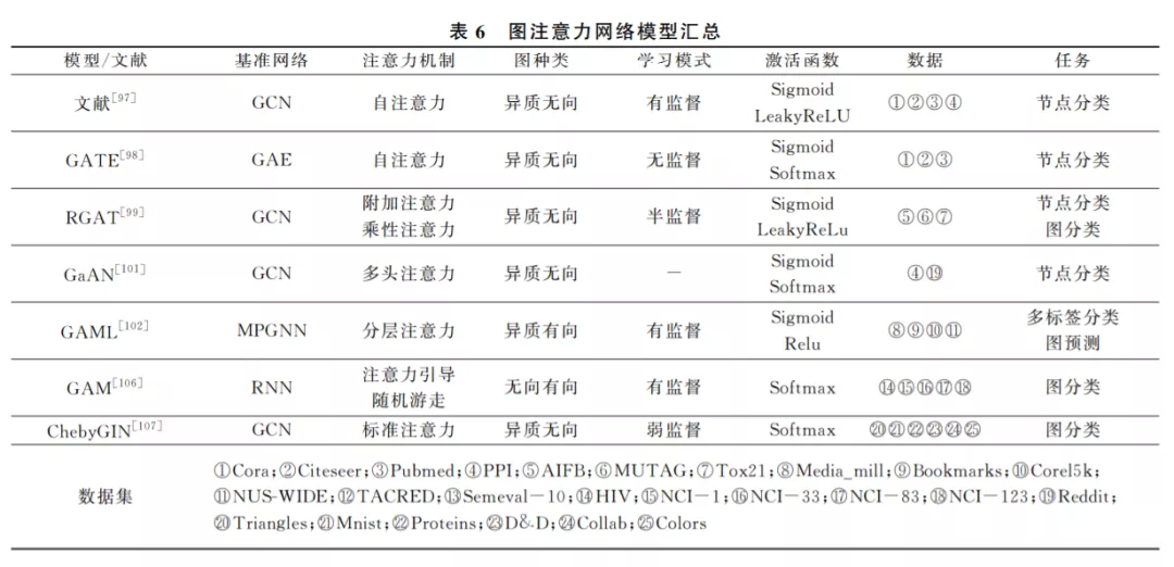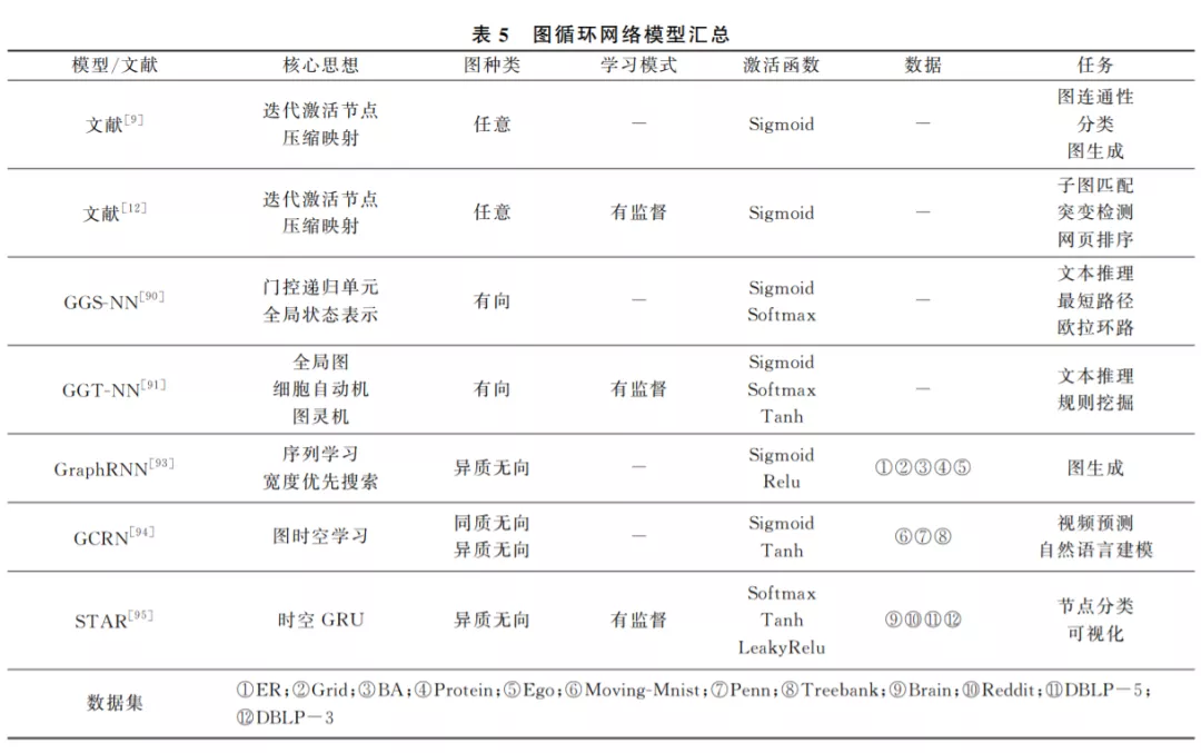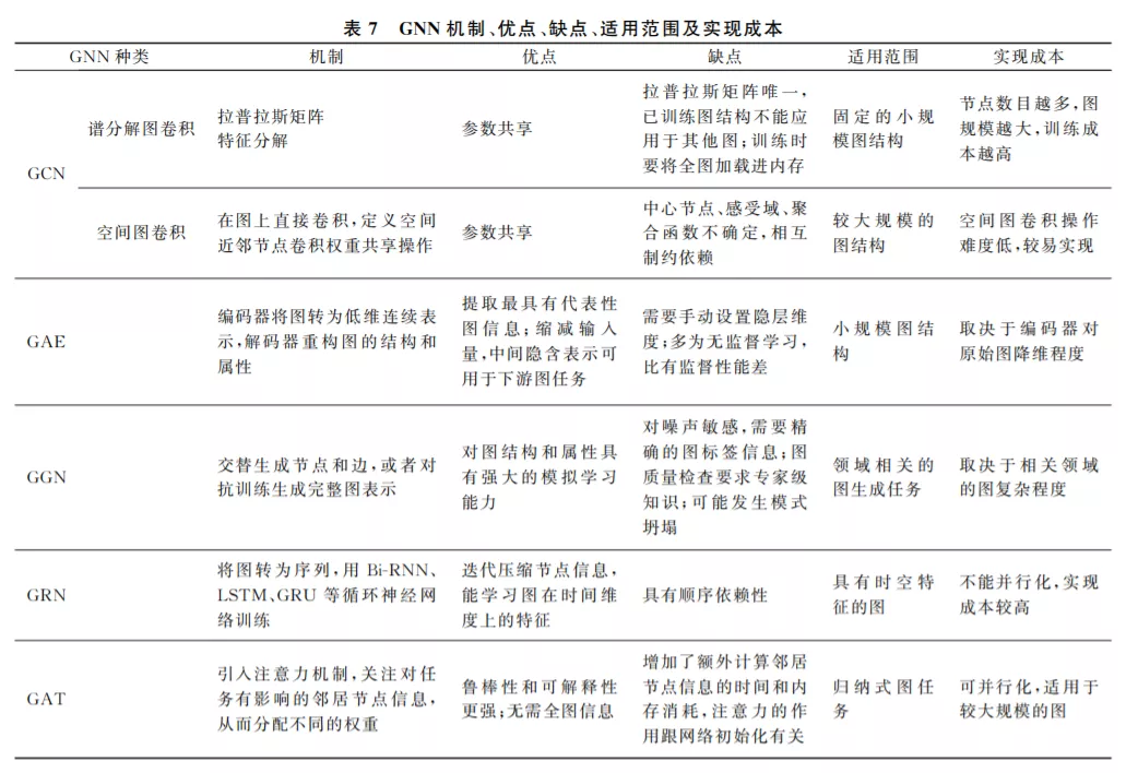 通过前文的归纳和分析, 从总体上看, 图神经网络可以分为五类: 图卷积网络、图自编码器、图生成网络、图循环网络和图注意力网络.每种图神经网络 都有自己对图结构数据处理的一套算法和体系,其 中的原理和适用的范围也有一定差别.当然它们之 间不是相互孤立和排斥的,例如文献[59,65]的图自 编码器中包含图卷积层,文献[91,95]的图循环网络 为了图序列学习更有效,也会加入注意力模块.而图 注意力网络也大多以其他图神经网络框架为基础, 构建合适的节点、边以及图注意力网络层.因此在实 际操作当中,需要根据图的分布和特征信息,以及任 务的实际需求,选择合适的图神经网络,来更加有效 地学习图结构数据. 表7是 GNN 机制、优点、缺点、 适用范围及实现成本汇总表。
