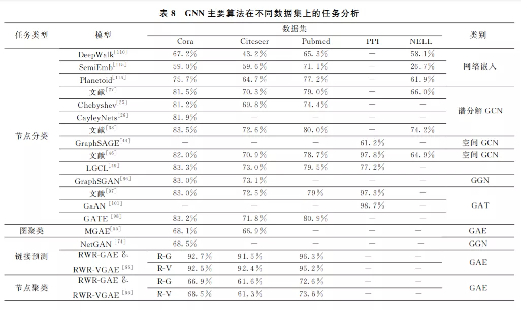 由于现实世界数据的复杂性,抽象出来的图结 构也会有很多的种类和变体.有向无向、异质非异 质、带权不带权等等,大部分的 GNN 仅能处理其中 的某一种类型.而更普遍的情况是各种各样的图混 杂在一起,并且希望 GNN 能满足诸如节点分类、图 分类、可视化、图生成等多种任务需求.在这种复杂 的高强度的任务要求下,单一的神经网络作用过于 有限.因此对于更加复杂的情况,有必要进行多网络 融合.目前比较主流的多网络融合方式是 GCN 与 其他 GNN 算法相结合.例如在节点属性和图拓扑 结构信息的获取上,GCN 明显具有较高的性能和良 好的适应性,在节点分类问题上会表现良好.鉴于其 优点,在 GAE中不乏部分模型使用 GCN 作为编码 器,取得较好的效果.但如果还需要进行链接预测、 节点生成或者图生成,GCN 则有点力不从心了.此 时可以再增设一个 GGN,输入 GCN 处理后的节点 嵌入向量,在 GGN 内生成概率分布,完成生成式任 务.如果图在不断地递归演进,形成了图序列.则可以 利用 GRN来处理,以攘括多个步骤下的图信息.因此 在 GNN框架中构造不同用途的深度神经网络,从不 同的侧面来提取和整合数据的特征是十分有必要的. 此 外 可 以 对 诸 如 深 度 置 信 网 络 (DeepBeliefNetwork)[151]、Transformer [152]等神经网络进行改造,将 其泛化和应用至图结构数据学习上。
