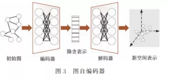 在 深 度 学 习 领 域,自 编 码 器 (Auto-encoder, AE)是一类将输入信息进行表征学习的人工神经网 络.自编码器一般包含编码器和解码器两个部分,基 于自编码器的 GNN 被称为图自编码器(GraphAuto-encoder,GAE),可以半监督或者无监督地学习 图节点信息.如图3所示