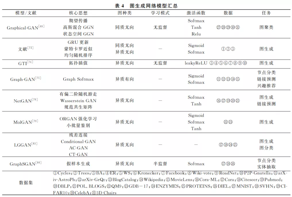 建模和生成图是研究生物工程和社会科学网络 的基础.图生成网络(GraphGenerativeNetwork, GGN)是一类用来生成图数据的 GNN,其使用一定 的规则对节点和边进行重新组合,最终生成具有特 定属性和要求的目标图.然而,在图上模拟复杂分 布,并从这些分布中有效地采样是比较困难的.因为 有些图数据具有非唯一性、高维性质,图中边缘之间 存在复杂的非局部依赖性.因此不能假设所有的图 数据都来自于同一个先验分布,尤其是对于异质图, 模型在识 别 过 程 中 必 须 要 具 有 平 移 不 变 性.因 此 GGN 着重用来解决这类问题和克服其中的难点. GGN 的输入可以是节点或者边向量,也可以是给定 的图嵌入表示,然后对采样的数据学习后合成各种 任务所需要的图.
