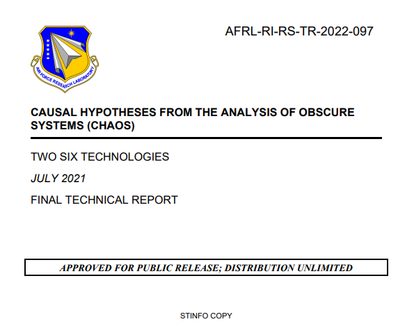 CHAOS是一种新颖的、革命性的科学发现方法,通过分析层自动生成因果和关联假设,并利用实时实验结果完善模型。CHAOS的分析技术可以自动识别跨时间和物理尺度的系统运行的稳定区域,其结果是为TA2表演者提供了一套强大的设计规则。完成这一挑战是由一个多学科的合作团队完成的,包括Two Six Technologies(prime)、Netrias、James York教授、Raytheon BBN和Eric Eaton博士。