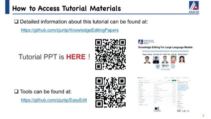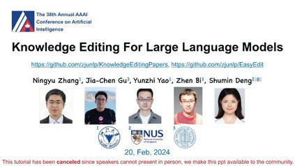 大型语言模型(LLMs)在生成类似人类的文本方面展现出巨大潜力,众多研究已经证明了这一点。尽管它们具有显著的能力,但像ChatGPT这样的LLMs有时会在保持事实准确性或逻辑一致性方面出错。它们可能会无意中生成有害或冒犯性的内容,并且对于它们训练阶段之后发生的事件一无所知。直观地说,手头上的挑战仍然是如何有效地更新这些LLMs或纠正它们的错误,而不需要进行完全的重新训练或持续的训练过程,这两者都可能非常耗费资源和时间。为此,已经提出了针对LLMs的知识编辑的概念,它提供了一种有效的方式来修改模型的行为,特别是在特定的兴趣领域内,而不会损害其对其他输入的性能。 我们将通过定义LLMs知识编辑中涉及的任务开始本教程,并介绍评估指标和基准数据集。随后,我们将提供各种知识编辑方法的概述。最初,我们的重点将放在保留LLMs参数的方法上。这些技术通过调整模型对某些实例的输出来实现,通过将辅助网络与原始未经触动的模型集成在一起。然后我们将转向修改LLMs参数的方法,这些方法旨在改变导致不希望输出的模型参数。在整个教程中,我们旨在分享从知识编辑研究的多元化社区中获得的洞见,并介绍开源工具EasyEdit。此外,我们将深入探讨与LLMs知识编辑相关的潜在问题以及机会,目标是向社区传授有价值的见解。所有教程幻灯片将在